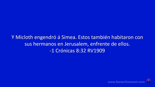 Y Micloth engendró á Simea. Estos también habitaron con sus hermanos en Jerusalem, enfrente de ellos. -1 Crónicas 8:32 RV1909