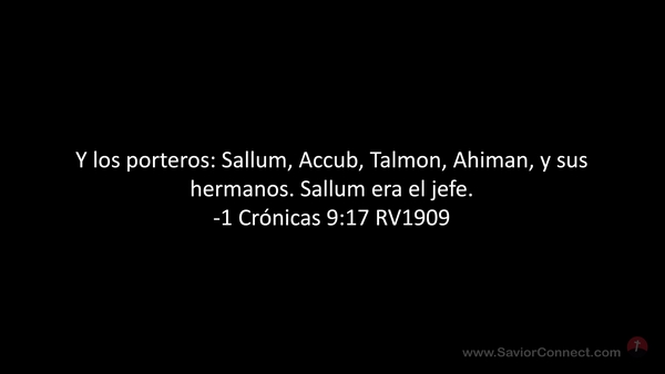 Y los porteros: Sallum, Accub, Talmon, Ahiman, y sus hermanos. Sallum era el jefe. -1 Crónicas 9:17 RV1909