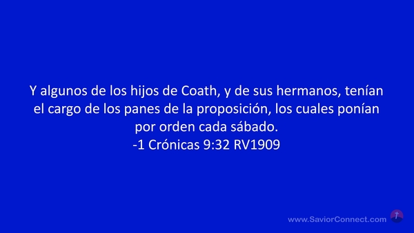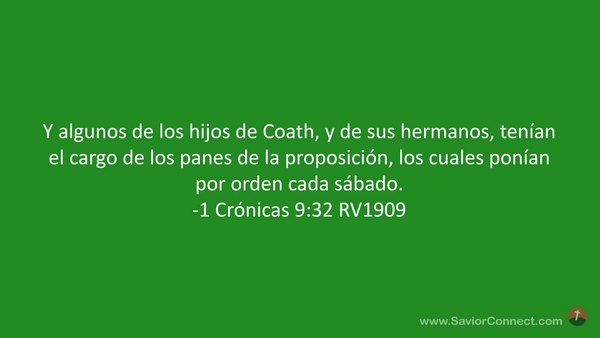 Y algunos de los hijos de Coath, y de sus hermanos, tenían el cargo de los panes de la proposición, los cuales ponían por orden cada sábado. -1 Crónicas 9:32 RV1909