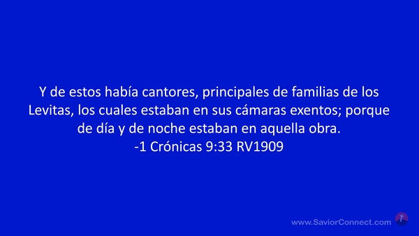 Y de estos había cantores, principales de familias de los Levitas, los cuales estaban en sus cámaras exentos; porque de día y de noche estaban en aquella obra. -1 Crónicas 9:33 RV1909