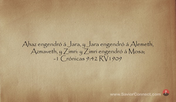 Ahaz engendró á Jara, y Jara engendró á Alemeth, Azmaveth, y Zimri: y Zimri engendró á Mosa; -1 Crónicas 9:42 RV1909