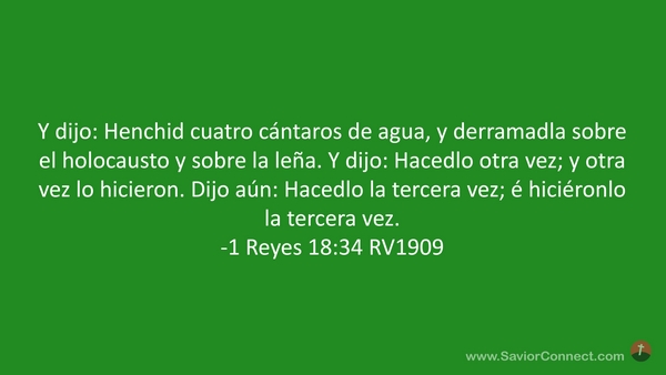 Y dijo: Henchid cuatro cántaros de agua, y derramadla sobre el holocausto y sobre la leña. Y dijo: Hacedlo otra vez; y otra vez lo hicieron. Dijo aún: Hacedlo la tercera vez; é hiciéronlo la tercera vez. -1 Reyes 18:34 RV1909