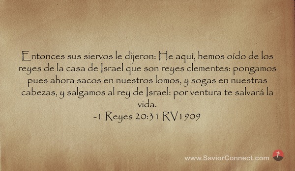 Entonces sus siervos le dijeron: He aquí, hemos oído de los reyes de la casa de Israel que son reyes clementes: pongamos pues ahora sacos en nuestros lomos, y sogas en nuestras cabezas, y salgamos al rey de Israel: por ventura te salvará la vida. -1 Reyes 20:31 RV1909