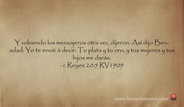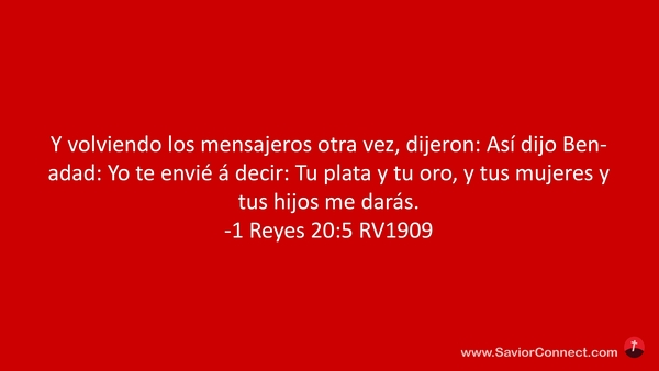 Y volviendo los mensajeros otra vez, dijeron: Así dijo Ben-adad: Yo te envié á decir: Tu plata y tu oro, y tus mujeres y tus hijos me darás. -1 Reyes 20:5 RV1909