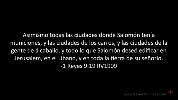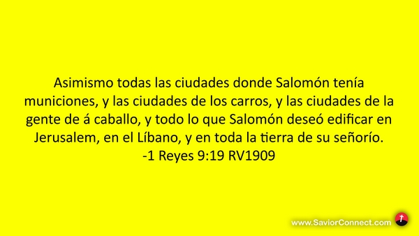 Asimismo todas las ciudades donde Salomón tenía municiones, y las ciudades de los carros, y las ciudades de la gente de á caballo, y todo lo que Salomón deseó edificar en Jerusalem, en el Líbano, y en toda la tierra de su señorío. -1 Reyes 9:19 RV1909