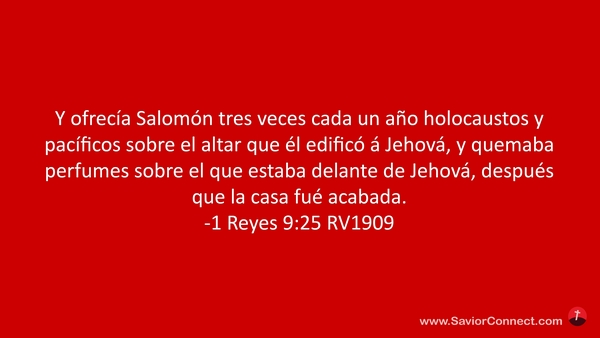 Y ofrecía Salomón tres veces cada un año holocaustos y pacíficos sobre el altar que él edificó á Jehová, y quemaba perfumes sobre el que estaba delante de Jehová, después que la casa fué acabada. -1 Reyes 9:25 RV1909