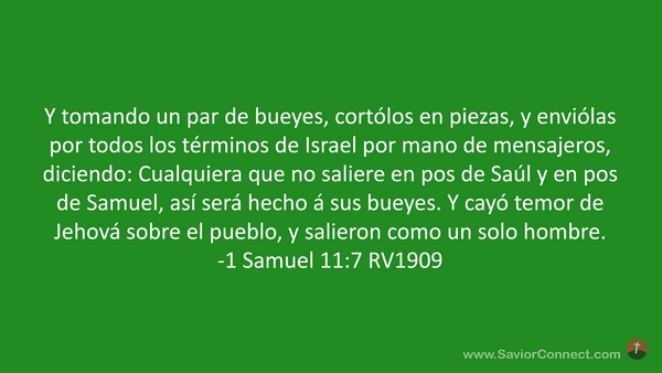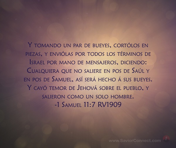 Y tomando un par de bueyes, cortólos en piezas, y enviólas por todos los términos de Israel por mano de mensajeros, diciendo: Cualquiera que no saliere en pos de Saúl y en pos de Samuel, así será hecho á sus bueyes. Y cayó temor de Jehová sobre el pueblo, y salieron como un solo hombre. -1 Samuel 11:7 RV1909