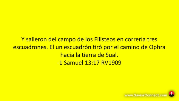 Y salieron del campo de los Filisteos en correría tres escuadrones. El un escuadrón tiró por el camino de Ophra hacia la tierra de Sual. -1 Samuel 13:17 RV1909