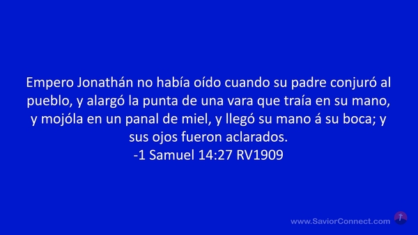Empero Jonathán no había oído cuando su padre conjuró al pueblo, y alargó la punta de una vara que traía en su mano, y mojóla en un panal de miel, y llegó su mano á su boca; y sus ojos fueron aclarados. -1 Samuel 14:27 RV1909