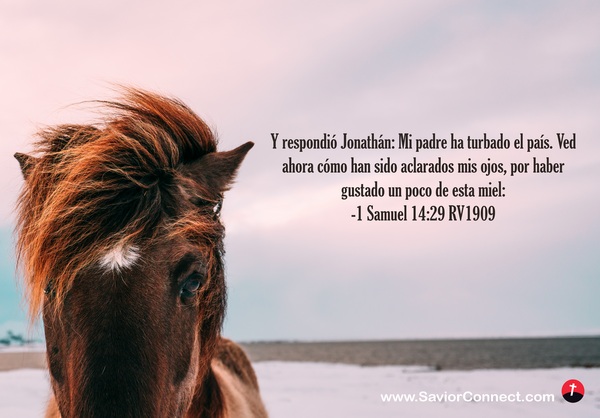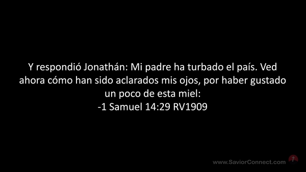 Y respondió Jonathán: Mi padre ha turbado el país. Ved ahora cómo han sido aclarados mis ojos, por haber gustado un poco de esta miel: -1 Samuel 14:29 RV1909