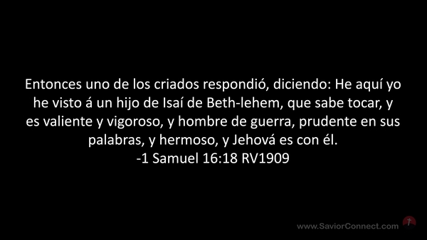 Entonces uno de los criados respondió, diciendo: He aquí yo he visto á un hijo de Isaí de Beth-lehem, que sabe tocar, y es valiente y vigoroso, y hombre de guerra, prudente en sus palabras, y hermoso, y Jehová es con él. -1 Samuel 16:18 RV1909