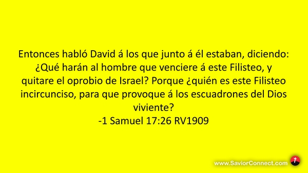 Entonces habló David á los que junto á él estaban, diciendo: ¿Qué harán al hombre que venciere á este Filisteo, y quitare el oprobio de Israel? Porque ¿quién es este Filisteo incircunciso, para que provoque á los escuadrones del Dios viviente? -1 Samuel 17:26 RV1909