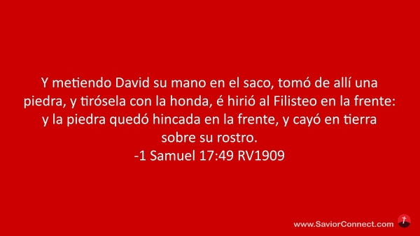 Y metiendo David su mano en el saco, tomó de allí una piedra, y tirósela con la honda, é hirió al Filisteo en la frente: y la piedra quedó hincada en la frente, y cayó en tierra sobre su rostro. -1 Samuel 17:49 RV1909