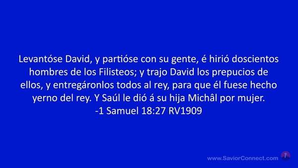 Levantóse David, y partióse con su gente, é hirió doscientos hombres de los Filisteos; y trajo David los prepucios de ellos, y entregáronlos todos al rey, para que él fuese hecho yerno del rey. Y Saúl le dió á su hija Michâl por mujer. -1 Samuel 18:27 RV1909