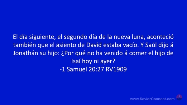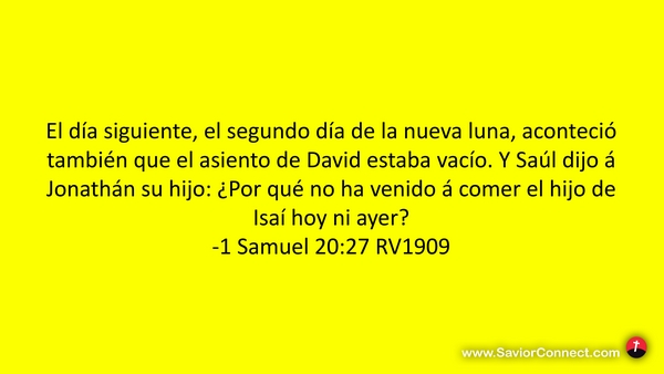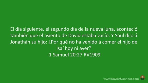 El día siguiente, el segundo día de la nueva luna, aconteció también que el asiento de David estaba vacío. Y Saúl dijo á Jonathán su hijo: ¿Por qué no ha venido á comer el hijo de Isaí hoy ni ayer? -1 Samuel 20:27 RV1909