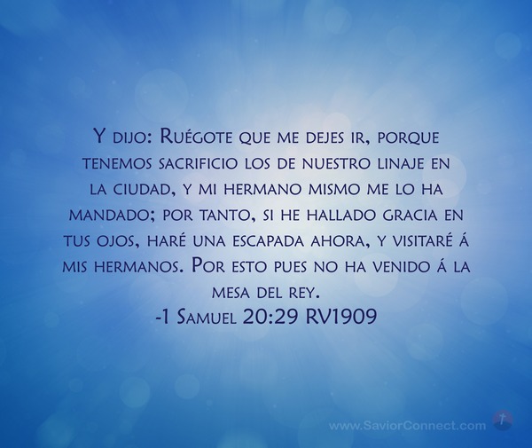Y dijo: Ruégote que me dejes ir, porque tenemos sacrificio los de nuestro linaje en la ciudad, y mi hermano mismo me lo ha mandado; por tanto, si he hallado gracia en tus ojos, haré una escapada ahora, y visitaré á mis hermanos. Por esto pues no ha venido á la mesa del rey. -1 Samuel 20:29 RV1909