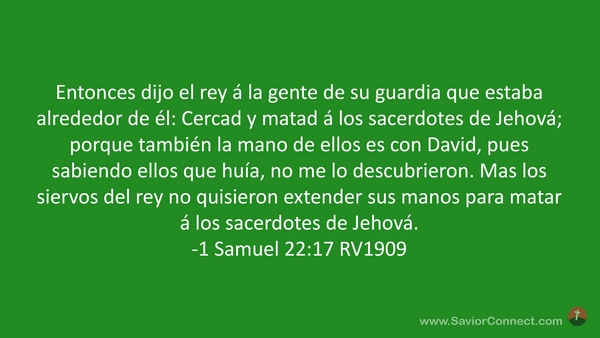 Entonces dijo el rey á la gente de su guardia que estaba alrededor de él: Cercad y matad á los sacerdotes de Jehová; porque también la mano de ellos es con David, pues sabiendo ellos que huía, no me lo descubrieron. Mas los siervos del rey no quisieron extender sus manos para matar á los sacerdotes de Jehová. -1 Samuel 22:17 RV1909