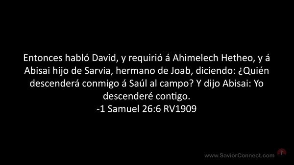 Entonces habló David, y requirió á Ahimelech Hetheo, y á Abisai hijo de Sarvia, hermano de Joab, diciendo: ¿Quién descenderá conmigo á Saúl al campo? Y dijo Abisai: Yo descenderé contigo. -1 Samuel 26:6 RV1909