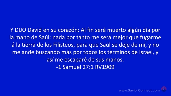Y DIJO David en su corazón: Al fin seré muerto algún día por la mano de Saúl: nada por tanto me será mejor que fugarme á la tierra de los Filisteos, para que Saúl se deje de mí, y no me ande buscando más por todos los términos de Israel, y así me escaparé de sus manos. -1 Samuel 27:1 RV1909
