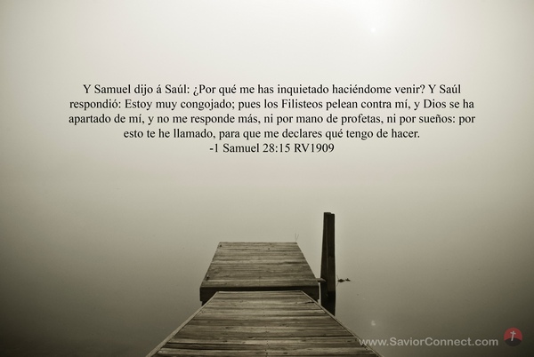 Y Samuel dijo á Saúl: ¿Por qué me has inquietado haciéndome venir? Y Saúl respondió: Estoy muy congojado; pues los Filisteos pelean contra mí, y Dios se ha apartado de mí, y no me responde más, ni por mano de profetas, ni por sueños: por esto te he llamado, para que me declares qué tengo de hacer. -1 Samuel 28:15 RV1909