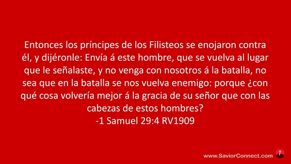 Entonces los príncipes de los Filisteos se enojaron contra él, y dijéronle: Envía á este hombre, que se vuelva al lugar que le señalaste, y no venga con nosotros á la batalla, no sea que en la batalla se nos vuelva enemigo: porque ¿con qué cosa volvería mejor á la gracia de su señor que con las cabezas de estos hombres? -1 Samuel 29:4 RV1909