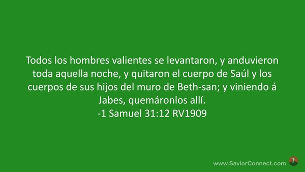 Todos los hombres valientes se levantaron, y anduvieron toda aquella noche, y quitaron el cuerpo de Saúl y los cuerpos de sus hijos del muro de Beth-san; y viniendo á Jabes, quemáronlos allí. -1 Samuel 31:12 RV1909