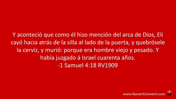 Y aconteció que como él hizo mención del arca de Dios, Eli cayó hacia atrás de la silla al lado de la puerta, y quebrósele la cerviz, y murió: porque era hombre viejo y pesado. Y había juzgado á Israel cuarenta años. -1 Samuel 4:18 RV1909