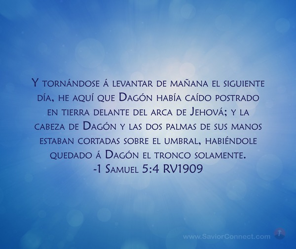 Y tornándose á levantar de mañana el siguiente día, he aquí que Dagón había caído postrado en tierra delante del arca de Jehová; y la cabeza de Dagón y las dos palmas de sus manos estaban cortadas sobre el umbral, habiéndole quedado á Dagón el tronco solamente. -1 Samuel 5:4 RV1909