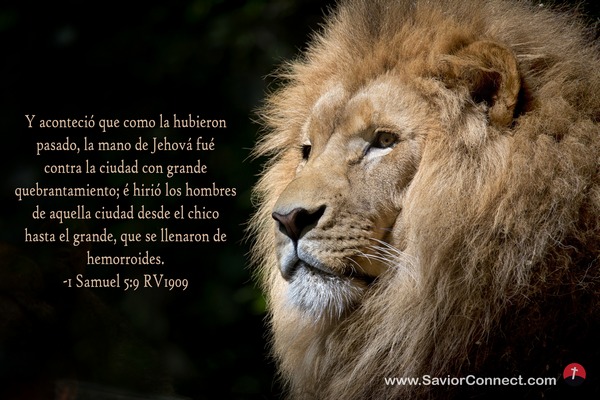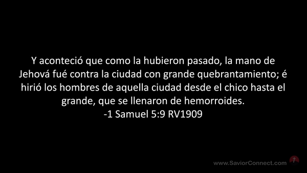 Y aconteció que como la hubieron pasado, la mano de Jehová fué contra la ciudad con grande quebrantamiento; é hirió los hombres de aquella ciudad desde el chico hasta el grande, que se llenaron de hemorroides. -1 Samuel 5:9 RV1909