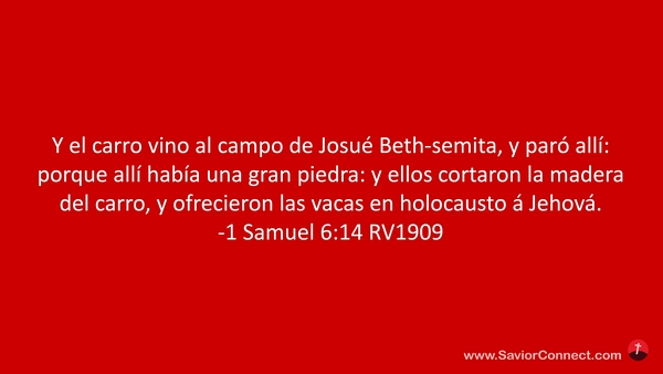 Y el carro vino al campo de Josué Beth-semita, y paró allí: porque allí había una gran piedra: y ellos cortaron la madera del carro, y ofrecieron las vacas en holocausto á Jehová. -1 Samuel 6:14 RV1909