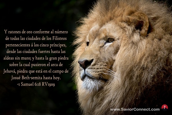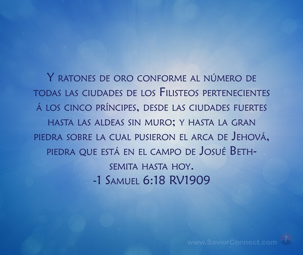Y ratones de oro conforme al número de todas las ciudades de los Filisteos pertenecientes á los cinco príncipes, desde las ciudades fuertes hasta las aldeas sin muro; y hasta la gran piedra sobre la cual pusieron el arca de Jehová, piedra que está en el campo de Josué Beth-semita hasta hoy. -1 Samuel 6:18 RV1909
