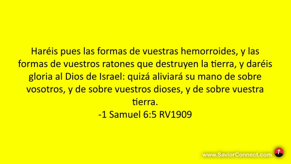 Haréis pues las formas de vuestras hemorroides, y las formas de vuestros ratones que destruyen la tierra, y daréis gloria al Dios de Israel: quizá aliviará su mano de sobre vosotros, y de sobre vuestros dioses, y de sobre vuestra tierra. -1 Samuel 6:5 RV1909