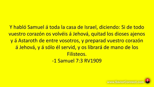 Y habló Samuel á toda la casa de Israel, diciendo: Si de todo vuestro corazón os volvéis á Jehová, quitad los dioses ajenos y á Astaroth de entre vosotros, y preparad vuestro corazón á Jehová, y á sólo él servid, y os librará de mano de los Filisteos. -1 Samuel 7:3 RV1909