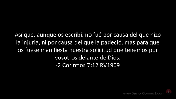 Así que, aunque os escribí, no fué por causa del que hizo la injuria, ni por causa del que la padeció, mas para que os fuese manifiesta nuestra solicitud que tenemos por vosotros delante de Dios. -2 Corintios 7:12 RV1909