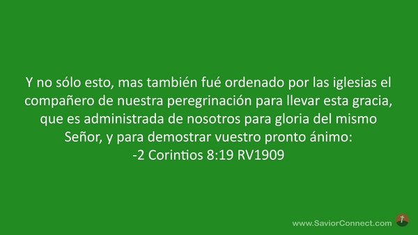 Y no sólo esto, mas también fué ordenado por las iglesias el compañero de nuestra peregrinación para llevar esta gracia, que es administrada de nosotros para gloria del mismo Señor, y para demostrar vuestro pronto ánimo: -2 Corintios 8:19 RV1909