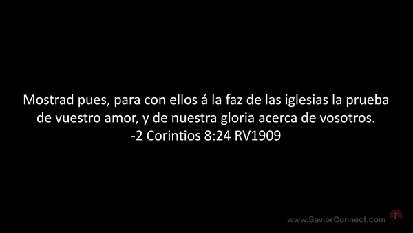 Mostrad pues, para con ellos á la faz de las iglesias la prueba de vuestro amor, y de nuestra gloria acerca de vosotros. -2 Corintios 8:24 RV1909