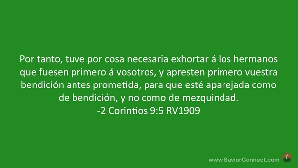 Por tanto, tuve por cosa necesaria exhortar á los hermanos que fuesen primero á vosotros, y apresten primero vuestra bendición antes prometida, para que esté aparejada como de bendición, y no como de mezquindad. -2 Corintios 9:5 RV1909