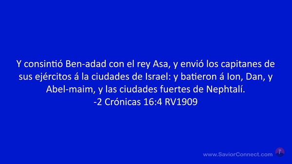 Y consintió Ben-adad con el rey Asa, y envió los capitanes de sus ejércitos á la ciudades de Israel: y batieron á Ion, Dan, y Abel-maim, y las ciudades fuertes de Nephtalí. -2 Crónicas 16:4 RV1909