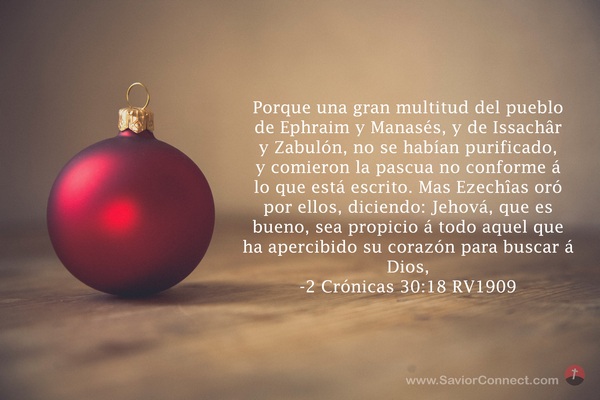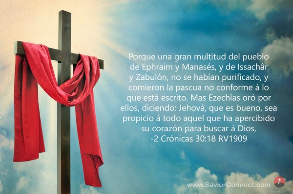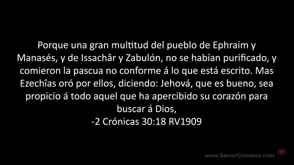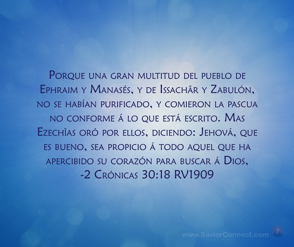 Porque una gran multitud del pueblo de Ephraim y Manasés, y de Issachâr y Zabulón, no se habían purificado, y comieron la pascua no conforme á lo que está escrito. Mas Ezechîas oró por ellos, diciendo: Jehová, que es bueno, sea propicio á todo aquel que ha apercibido su corazón para buscar á Dios, -2 Crónicas 30:18 RV1909