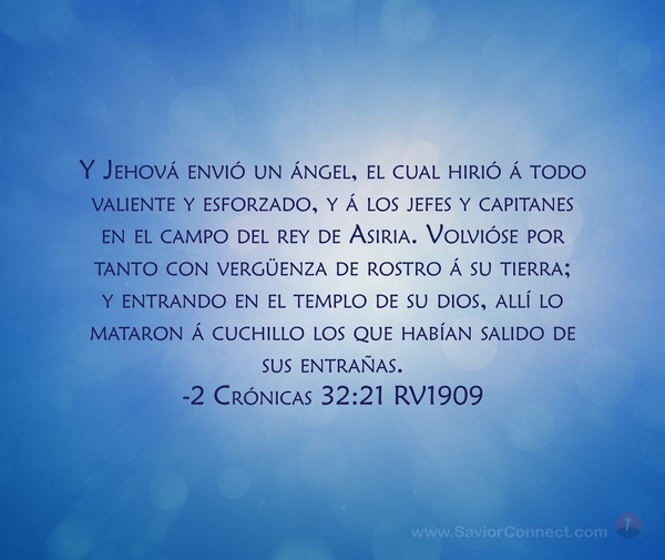 Y Jehová envió un ángel, el cual hirió á todo valiente y esforzado, y á los jefes y capitanes en el campo del rey de Asiria. Volvióse por tanto con vergüenza de rostro á su tierra; y entrando en el templo de su dios, allí lo mataron á cuchillo los que habían salido de sus entrañas. -2 Crónicas 32:21 RV1909