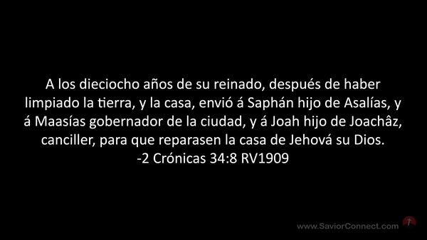 A los dieciocho años de su reinado, después de haber limpiado la tierra, y la casa, envió á Saphán hijo de Asalías, y á Maasías gobernador de la ciudad, y á Joah hijo de Joachâz, canciller, para que reparasen la casa de Jehová su Dios. -2 Crónicas 34:8 RV1909