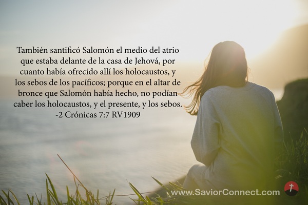 También santificó Salomón el medio del atrio que estaba delante de la casa de Jehová, por cuanto había ofrecido allí los holocaustos, y los sebos de los pacíficos; porque en el altar de bronce que Salomón había hecho, no podían caber los holocaustos, y el presente, y los sebos. -2 Crónicas 7:7 RV1909