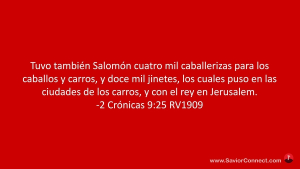 Tuvo también Salomón cuatro mil caballerizas para los caballos y carros, y doce mil jinetes, los cuales puso en las ciudades de los carros, y con el rey en Jerusalem. -2 Crónicas 9:25 RV1909