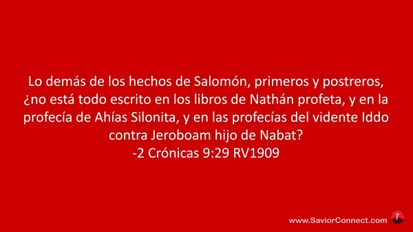 Lo demás de los hechos de Salomón, primeros y postreros, ¿no está todo escrito en los libros de Nathán profeta, y en la profecía de Ahías Silonita, y en las profecías del vidente Iddo contra Jeroboam hijo de Nabat? -2 Crónicas 9:29 RV1909