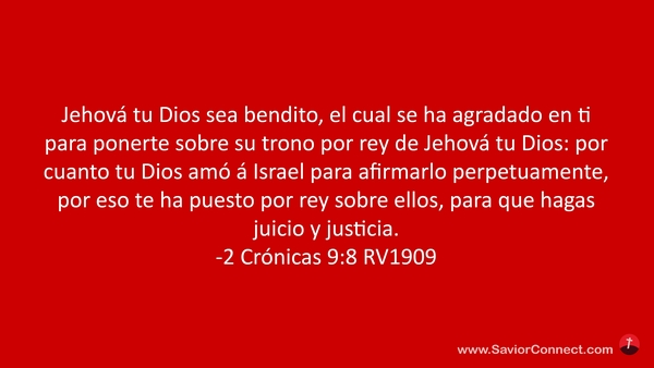 Jehová tu Dios sea bendito, el cual se ha agradado en ti para ponerte sobre su trono por rey de Jehová tu Dios: por cuanto tu Dios amó á Israel para afirmarlo perpetuamente, por eso te ha puesto por rey sobre ellos, para que hagas juicio y justicia. -2 Crónicas 9:8 RV1909