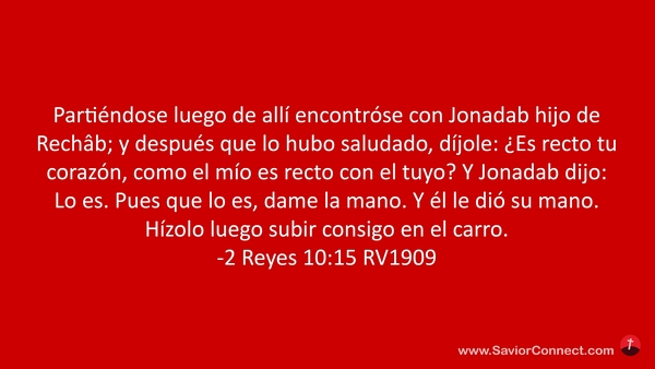 Partiéndose luego de allí encontróse con Jonadab hijo de Rechâb; y después que lo hubo saludado, díjole: ¿Es recto tu corazón, como el mío es recto con el tuyo? Y Jonadab dijo: Lo es. Pues que lo es, dame la mano. Y él le dió su mano. Hízolo luego subir consigo en el carro. -2 Reyes 10:15 RV1909