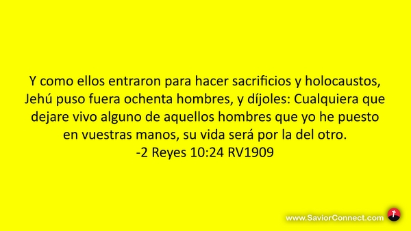 Y como ellos entraron para hacer sacrificios y holocaustos, Jehú puso fuera ochenta hombres, y díjoles: Cualquiera que dejare vivo alguno de aquellos hombres que yo he puesto en vuestras manos, su vida será por la del otro. -2 Reyes 10:24 RV1909