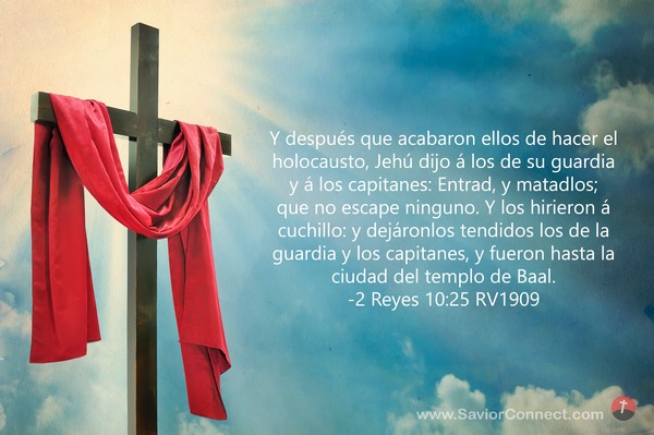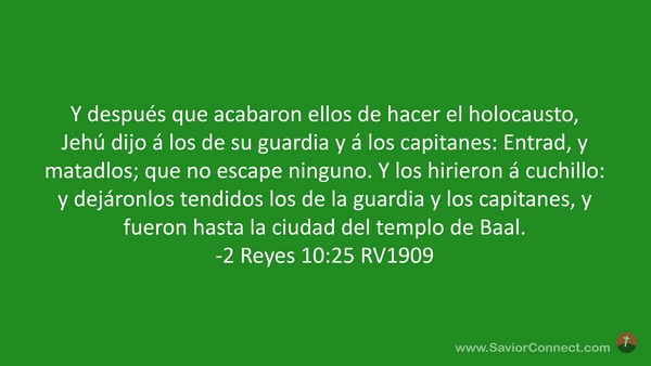 Y después que acabaron ellos de hacer el holocausto, Jehú dijo á los de su guardia y á los capitanes: Entrad, y matadlos; que no escape ninguno. Y los hirieron á cuchillo: y dejáronlos tendidos los de la guardia y los capitanes, y fueron hasta la ciudad del templo de Baal. -2 Reyes 10:25 RV1909