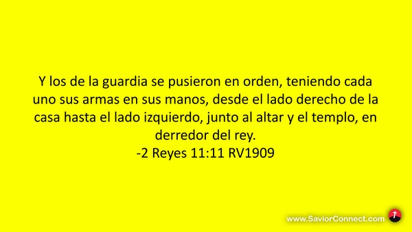Y los de la guardia se pusieron en orden, teniendo cada uno sus armas en sus manos, desde el lado derecho de la casa hasta el lado izquierdo, junto al altar y el templo, en derredor del rey. -2 Reyes 11:11 RV1909