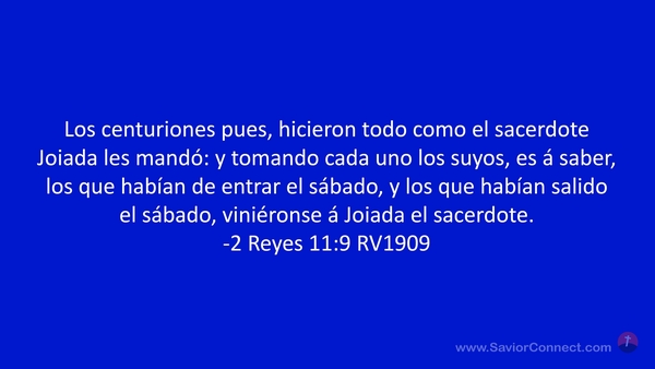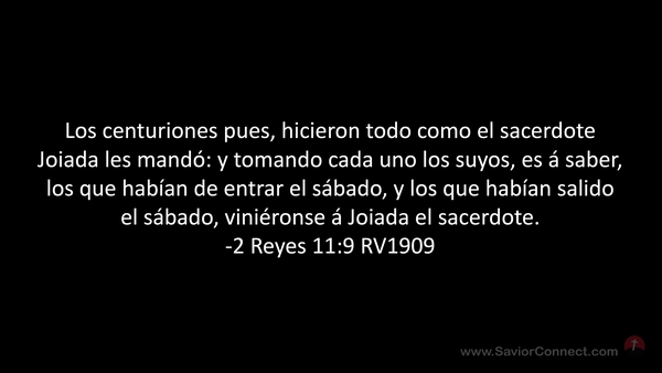 Los centuriones pues, hicieron todo como el sacerdote Joiada les mandó: y tomando cada uno los suyos, es á saber, los que habían de entrar el sábado, y los que habían salido el sábado, viniéronse á Joiada el sacerdote. -2 Reyes 11:9 RV1909